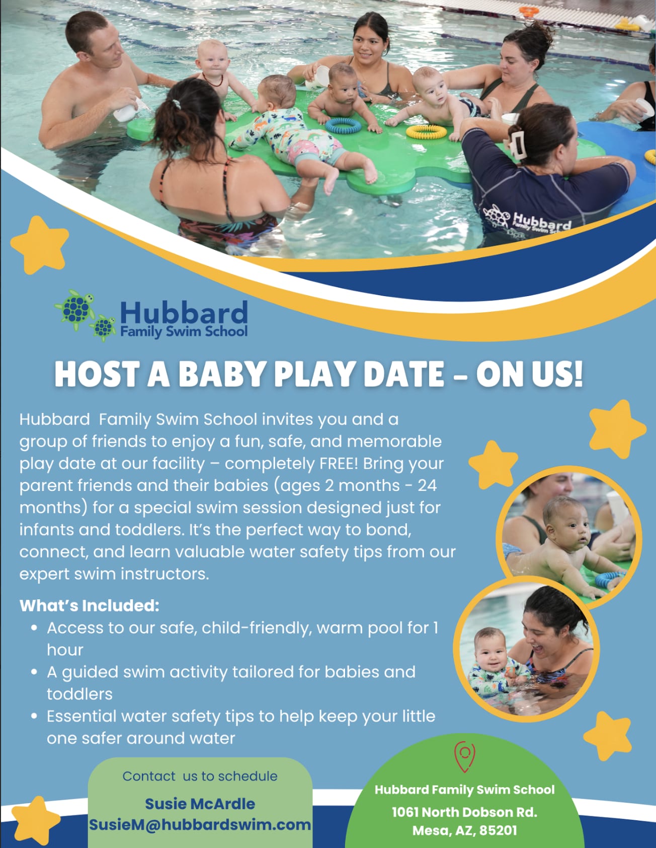 We welcome parents and babies under the age of 2 for a free hour of water safety and skills. Invite your friends to join (groups of 5-10) and host a play date on us!