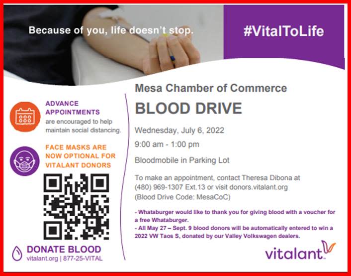 Help the national blood shortage by donating the gift of life at the Mesa Chamber of Commerce. For information call Theresa DiBona at 480-969-1307 ext. 10.