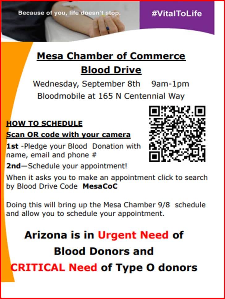 Arizona is in urgent need of blood and you can help. Pledge to donate blood with the Mesa Chamber of Commerce and Vitalant online. Simply schedule an appointment by scanning the QR code and be ready to donate!