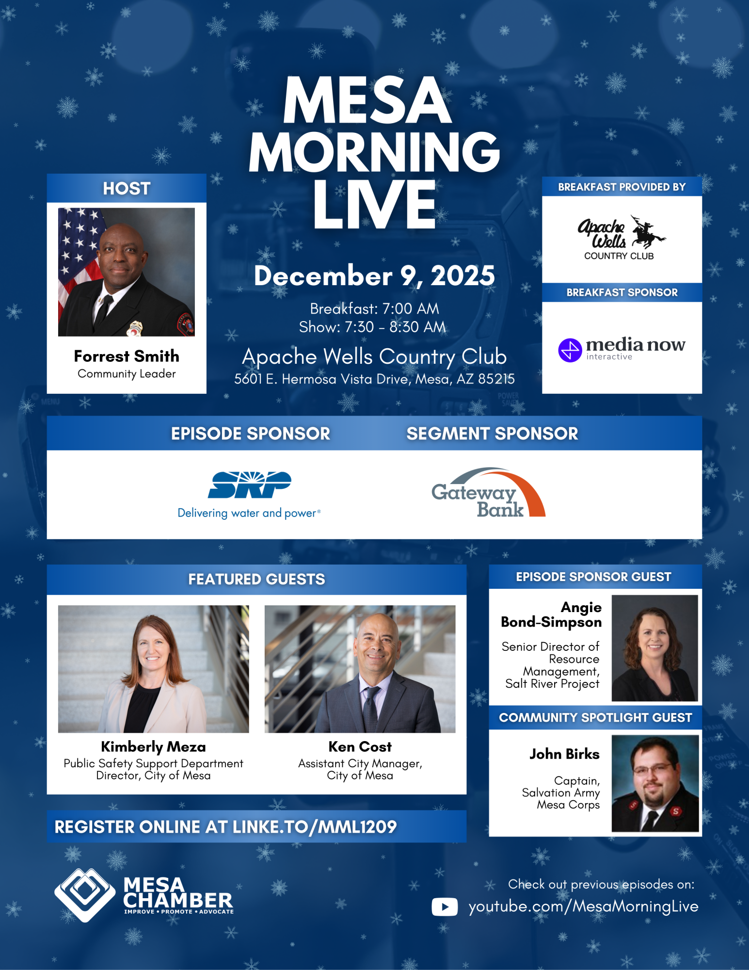 Join us for a new episode of Mesa Morning Live, featuring special guests Kim Meza from the Public Safety Support Department and Assistant City Manager Ken Cost, who will discuss public safety in Mesa.