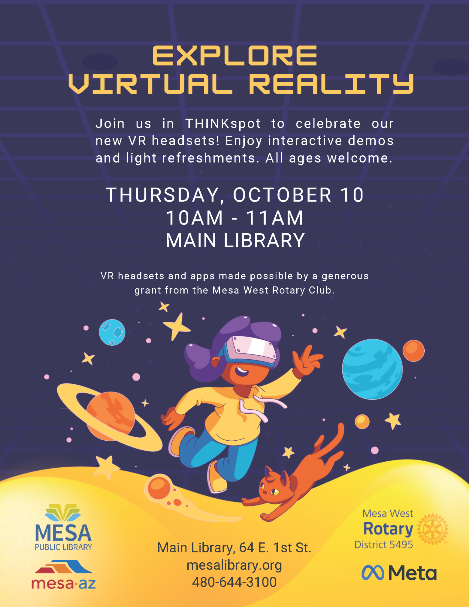 Join the Mesa Public Library in THINKspot to celebrate their new VR headsets! Enjoy interactive demos and light refreshments. All ages welcome.