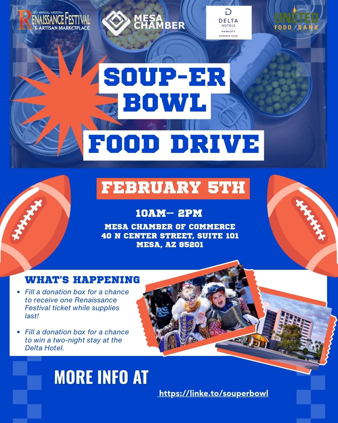 In the spirit of Super Bowl weekend, join us at the Chamber for our Soup-er Bowl Canned Food Drive on February 5th! Bring your donations of canned goods to support United Food Bank, and score some fantastic incentives from Delta Hotels Phoenix Mesa and the Renaissance Festival all just for giving!