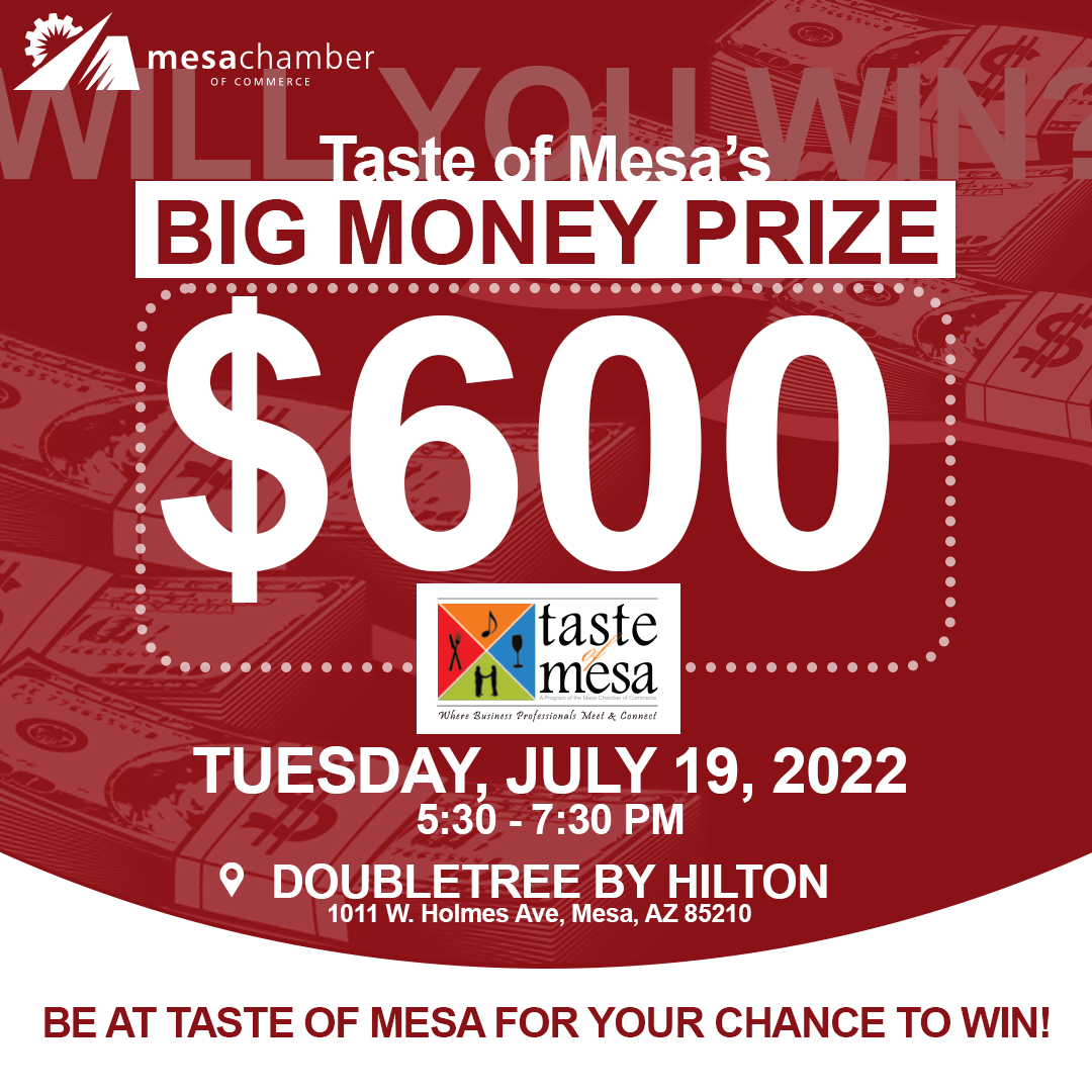 Become the next Big Prize Sponsor! Contact the Chamber and get these great benefits: listed (with link to your Chamber profile) in the public Calendar. You get to host the presentation portion of Taste of Mesa and talk about you, your business and hopefully, bring the joy of winning the Big Prize to a member!