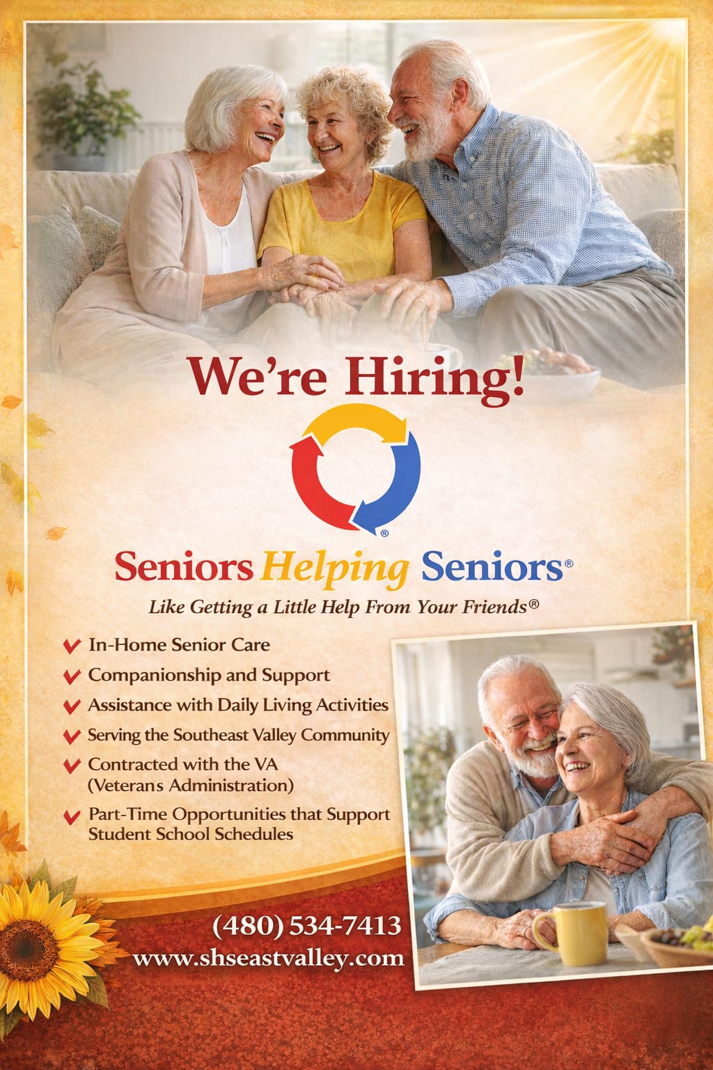 Seniors Helping Seniors East Valley is seeking caregivers of all ages to provide hands-on support to clients throughout the southeast valley.  Part-time positions available that can be anything from 2 hours per day/week/month to as many hours as the caregiver wishes to take on.  Hands-on care includes assistance with showering/toileting/dressing and other duties can include companionship, meal prep, light housekeeping, etc.  Inquiries can be made online at www.shseastvalley.com or by calling 480-534-7413.